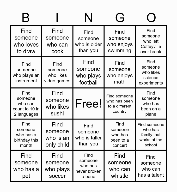 This bingo card has a free space and 24 words: Find someone who has a pet, Find someone who is an only child, Find someone who plays football, Find someone who can whistle, Find someone who left Coffeyville over break, Find someone who loves to draw, Find someone who can cook, Find someone who is older than you, Find someone who has been to a different country, Find someone who has been on a plane, Find someone who can count to 10 in 2 languages, Find someone who likes video games, Find someone who has been to a concert, Find someone who has family that works at the school, Find someone who plays an instrument, Find someone who plays soccer, Find someone who has never broken a bone, Find someone who enjoys swimming, Find someone who likes science experiments, Find someone who has a birthday this month, Find someone who likes sushi, Find someone who is taller than you, Find someone who enjoys math and Find someone who can has a talent.