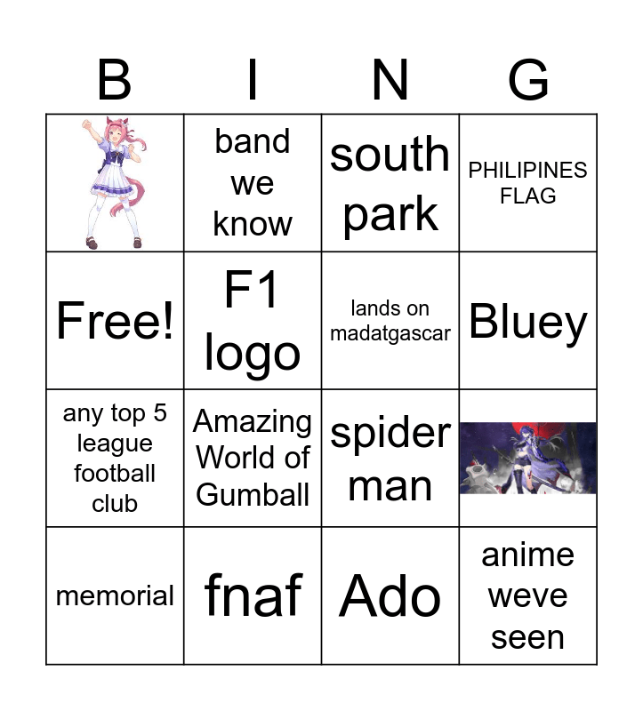 This bingo card has 2 images and 14 words: fnaf, south park, any top 5 league football club, band we know, spider man, Ado, Free!, F1 logo, memorial, PHILIPINES FLAG, Amazing World of Gumball, Bluey, lands on madatgascar and anime weve seen.