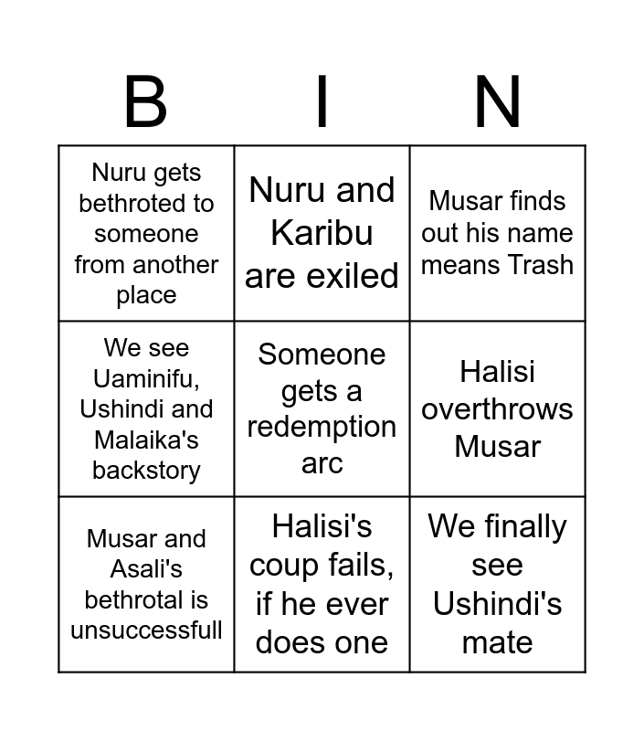 This bingo card has a free space and 8 words: Halisi overthrows Musar, Musar finds out his name means Trash, Nuru and Karibu are exiled, Musar and Asali's bethrotal is unsuccessfull, Nuru gets bethroted to someone from another place, We finally see Ushindi's mate, We see Uaminifu, Ushindi and Malaika's backstory and Halisi's coup fails, if he ever does one.