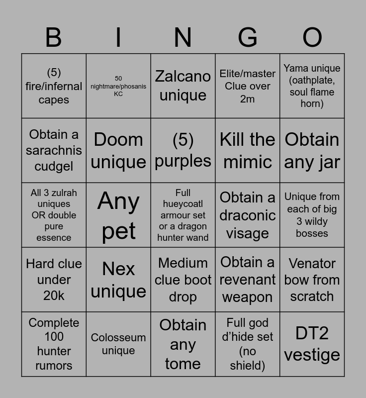 This bingo card has 25 words: Nex unique, Obtain any tome, (5) purples, Complete 100 hunter rumors, Yama unique (oathplate, soul flame horn), (5) fire/infernal capes, Obtain a sarachnis cudgel, 50 nightmare/phosanis KC, Obtain a draconic visage, Medium clue boot drop, Kill the mimic, All 3 zulrah uniques OR double pure essence, Obtain a revenant weapon, Venator bow from scratch, Doom unique, DT2 vestige, Unique from each of big 3 wildy bosses, Zalcano unique, Obtain any jar, Any pet, Full hueycoatl armour set or a dragon hunter wand, Colosseum unique, Hard clue under 20k, Elite/master Clue over 2m and Full god d’hide set (no shield).