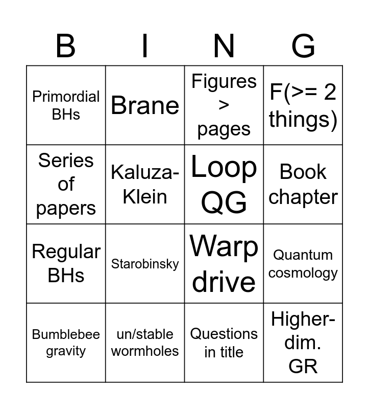 This bingo card has 44 words: >= 4 word theory, Bumblebee gravity, Traversable wormholes, scalar-tensor, Machine learning, Massive gravity, Figures > pages, Dark energy, Series of papers, Comment on, F(>= 2 things), un/stable wormholes, >20 authors, Gauss-Bonnet, Boson stars, Dark matter, Bouncing models, Warp drive, AdS, Starobinsky, Brane, Cosmic strings, Latex maths in title, Primordial BHs, Slow-roll, Questions in title, >= 100 pages (not thesis), Swampland, SGWB, Higher-dim. GR, QNMs, Philosophy/history cross-post, Gravastar, (near-)extremal Kerr, Quantum cosmology, CMB, Code paper, Essay, Book chapter, Kaluza-Klein, Regular BHs, BH Mimickers, Loop QG and Revisit(ed)/(ing).
