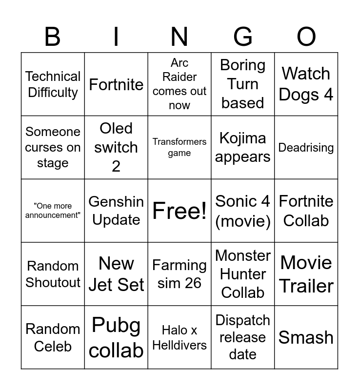 This bingo card has a free space and 24 words: New Jet Set, Pubg collab, Transformers game, Random Celeb, Watch Dogs 4, Technical Difficulty, Someone curses on stage, Fortnite, Sonic 4 (movie), Farming sim 26, Kojima appears, "One more announcement", Monster Hunter Collab, Movie Trailer, Oled switch 2, Dispatch release date, Fortnite Collab, Arc Raider comes out now, Deadrising, Genshin Update, Smash, Random Shoutout, Boring Turn based and Halo x Helldivers.