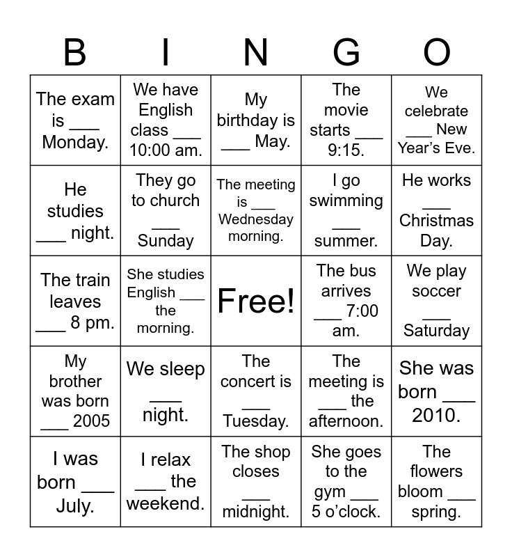 This bingo card has a free space and 29 words: I was born ___ July., The party is ___ Friday., She studies English ___ the morning., We eat lunch ___ 12:30., The exam is ___ Monday., My birthday is ___ May., They go to church ___ Sunday, We sleep ___ night., The bus arrives ___ 7:00 am., I relax ___ the weekend., We play soccer ___ Saturday, The flowers bloom ___ spring., The shop closes ___ midnight., She goes to the gym ___ 5 o’clock., He works ___ Christmas Day., The leaves fall ___ autumn., The concert is ___ Tuesday., My brother was born ___ 2005, We celebrate ___ New Year’s Eve., The train leaves ___ 8 pm., The meeting is ___ the afternoon., I usually wake up ___ 6:30., I go swimming ___ summer., He studies ___ night., The movie starts ___ 9:15., We have English class ___ 10:00 am., She was born ___ 2010., The meeting is ___ Wednesday morning. and We usually travel ___ December..