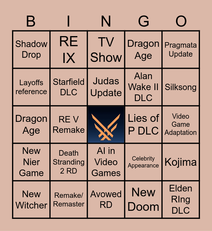 This bingo card has a free space and 24 words: Death Stranding 2 RD, Remake/ Remaster, Judas Update, New Witcher, Pragmata Update, Shadow Drop, Layoffs reference, RE IX, Lies of P DLC, AI in Video Games, Alan Wake II DLC, Dragon Age, Celebrity Appearance, Kojima, Starfield DLC, New Doom, Video Game Adaptation, TV Show, Silksong, RE V Remake, Elden RIng DLC, New Nier Game, Dragon Age and Avowed RD.