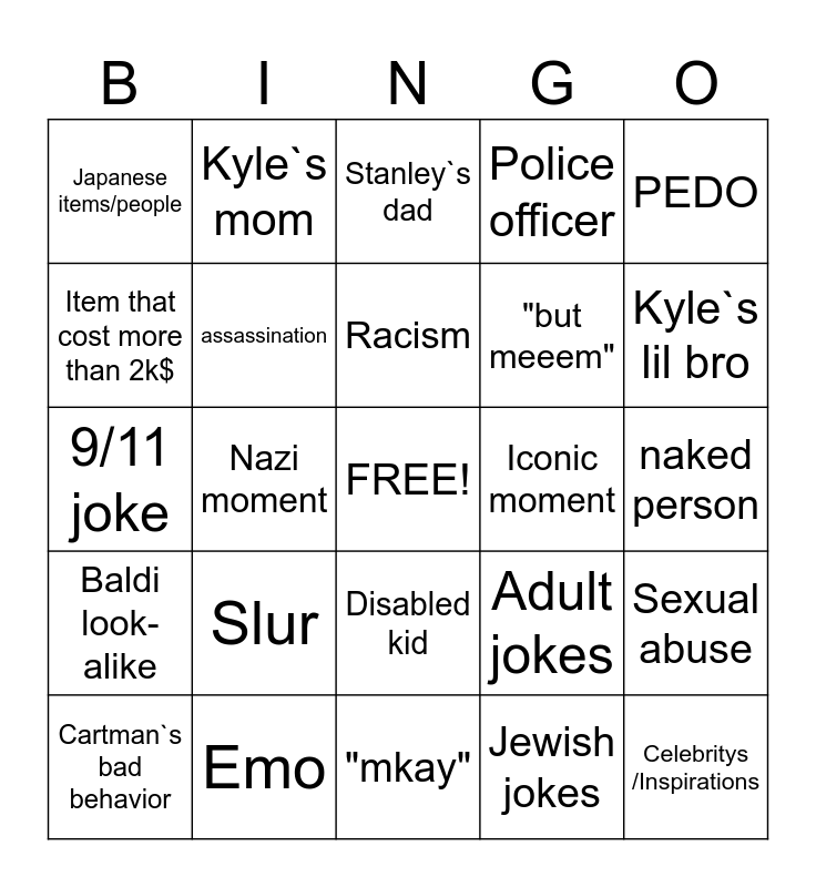 This bingo card has a free space and 24 words: Cartman`s bad behavior, Slur, Racism, Jewish jokes, PEDO, Japanese items/people, Kyle`s mom, Stanley`s dad, Iconic moment, naked person, 9/11 joke, assassination, Adult jokes, Sexual abuse, Item that cost more than 2k$, Emo, "mkay", Police officer, Kyle`s lil bro, Baldi look-alike, Nazi moment, Disabled kid, "but meeem" and Celebritys /Inspirations.