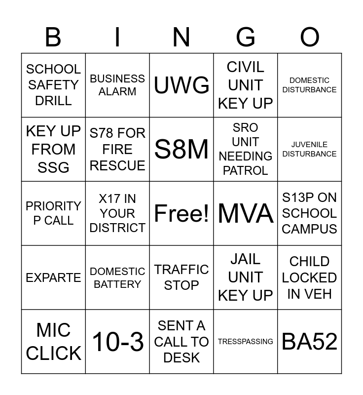 This bingo card has a free space and 24 words: DOMESTIC BATTERY, 10-3, S8M, MIC CLICK, DOMESTIC DISTURBANCE, SCHOOL SAFETY DRILL, KEY UP FROM SSG, BUSINESS ALARM, MVA, TRAFFIC STOP, SRO UNIT NEEDING PATROL, PRIORITY P CALL, JAIL UNIT KEY UP, CHILD LOCKED IN VEH, S78 FOR FIRE RESCUE, TRESSPASSING, S13P ON SCHOOL CAMPUS, UWG, JUVENILE DISTURBANCE, X17 IN YOUR DISTRICT, BA52, EXPARTE, CIVIL UNIT KEY UP and SENT A CALL TO DESK.