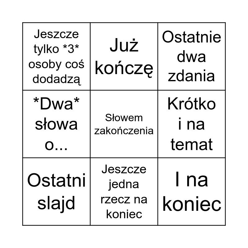 This bingo card has a free space and 8 words: Krótko i na temat, Ostatnie dwa zdania, Już kończę, Ostatni slajd, Jeszcze tylko *3* osoby coś dodadzą, I na koniec, *Dwa* słowa o... and Jeszcze jedna rzecz na koniec.