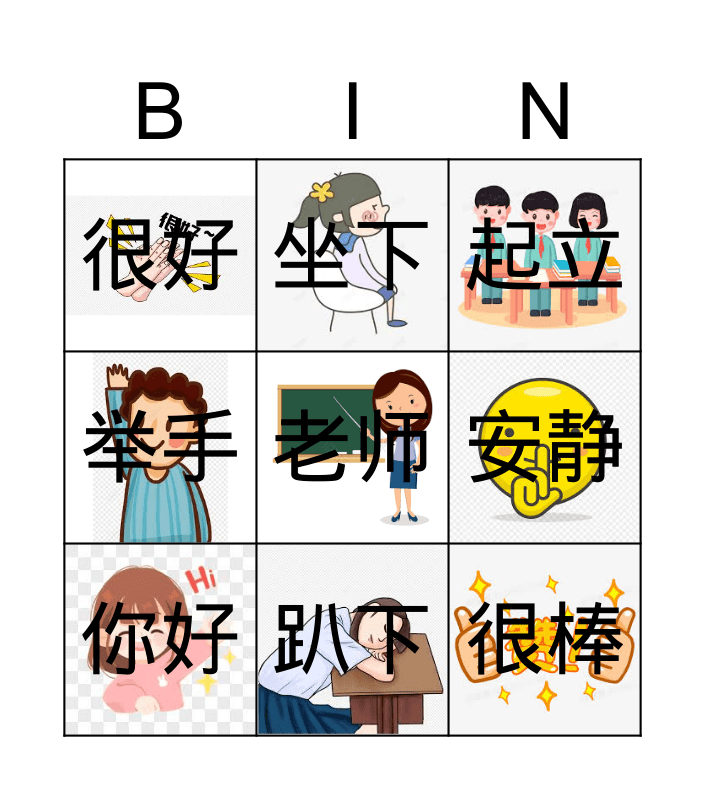 This bingo card has 8 images, a free space and 8 words: 安静, 起立, 坐下, 你好, 很好, 很棒, 举手 and 趴下.