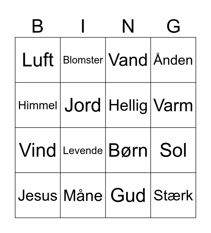 This bingo card has 16 words: Måne, Sol, Vand, Luft, Vind, Blomster, Børn, Gud, Himmel, Jord, Jesus, Ånden, Levende, Varm, Hellig and Stærk.