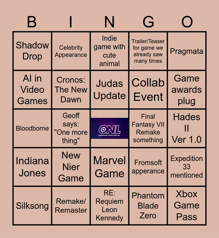 This bingo card has a free space and 24 words: New Nier Game, Remake/ Remaster, Judas Update, Silksong, Pragmata, Shadow Drop, AI in Video Games, Celebrity Appearance, Final Fantasy VII Remake something, Marvel Game, Collab Event, Bloodborne, Fromsoft apperance, Expedition 33 mentioned, Cronos: The New Dawn, Phantom Blade Zero, Hades II Ver 1.0, Indie game with cute animal, Game awards plug, Geoff says: "One more thing", Xbox Game Pass, Indiana Jones, Trailer/Teaser for game we already saw many times and RE: Requiem Leon Kennedy.
