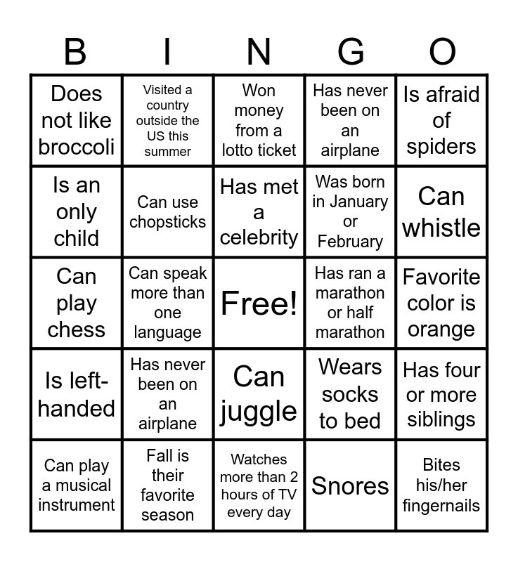 This bingo card has a free space and 24 words: Has never been on an airplane, Fall is their favorite season, Has met a celebrity, Can play a musical instrument, Is afraid of spiders, Does not like broccoli, Is an only child, Visited a country outside the US this summer, Has ran a marathon or half marathon, Can juggle, Was born in January or February, Can play chess, Wears socks to bed, Has four or more siblings, Can use chopsticks, Snores, Favorite color is orange, Won money from a lotto ticket, Can whistle, Can speak more than one language, Bites his/her fingernails, Is left- handed, Has never been on an airplane and Watches more than 2 hours of TV every day.