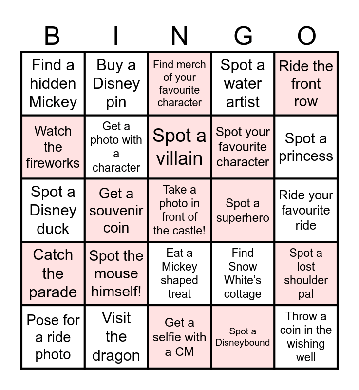 This bingo card has a free space and 24 words: Spot the mouse himself!, Visit the dragon, Spot a villain, Pose for a ride photo, Ride the front row, Find a hidden Mickey, Watch the fireworks, Buy a Disney pin, Spot a superhero, Eat a Mickey shaped treat, Spot your favourite character, Spot a Disney duck, Find Snow White’s cottage, Spot a lost shoulder pal, Get a photo with a character, Spot a Disneybound, Ride your favourite ride, Find merch of your favourite character, Spot a princess, Get a souvenir coin, Throw a coin in the wishing well, Catch the parade, Spot a water artist and Get a selfie with a CM.