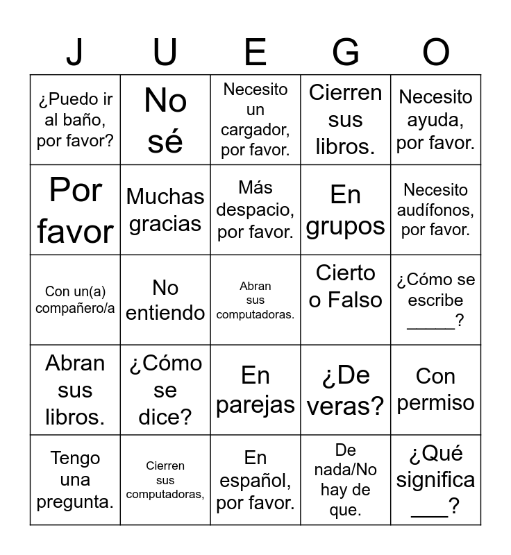This bingo card has 25 words: ¿Cómo se dice?, En español, por favor., Más despacio, por favor., Tengo una pregunta., Necesito ayuda, por favor., ¿Puedo ir al baño, por favor?, Por favor, No sé, Cierto o Falso, En parejas, En grupos, Con un(a) compañero/a, ¿De veras?, Con permiso, Muchas gracias, ¿Qué significa ___?, ¿Cómo se escribe _____?, Necesito un cargador, por favor., Necesito audífonos, por favor., No entiendo, Abran sus computadoras., Cierren sus computadoras,, Abran sus libros., Cierren sus libros. and De nada/No hay de que..