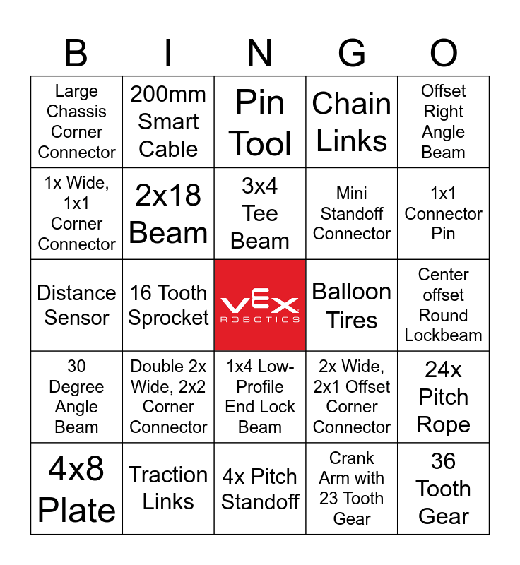 This bingo card has a free space and 39 words: 1x2 Beam, 1x8 Beam, 2x7 Beam, 2x18 Beam, 4x8 Plate, 1x4 Low-Profile End Lock Beam, 3x4 Tee Beam, 1x3 Center Lock Beam, Offset Right Angle Beam, 30 Degree Angle Beam, 16 Tooth Sprocket, Chain Links, 36 Tooth Gear, Center offset Round Lockbeam, Balloon Tires, Double 2x Wide, 2x2 Corner Connector, Triple 2x Wide, 2x2 Corner Connector, Large Chassis Corner Connector, 2x Wide, 2x2 Offset Corner Connector, 2x Wide, 2x1 Offset Corner Connector, 1x Wide, 1x1 Corner Connector, 4x Pitch Standoff, Mini Standoff Connector, 1x1 Connector Pin, 0x2 Idler Pin, 5x Pitch Capped Shafts, 3x Pitch Capped Plastic Shafts, 3x Pitch Motor Shafts, Rubber Shaft Collar, 200mm Smart Cable, Bumper Switch, Optical Sensor, Pin Tool, Traction Links, Crank Arm with 23 Tooth Gear, Cable Anchor, 24x Pitch Rope, Distance Sensor and Robot Brain.