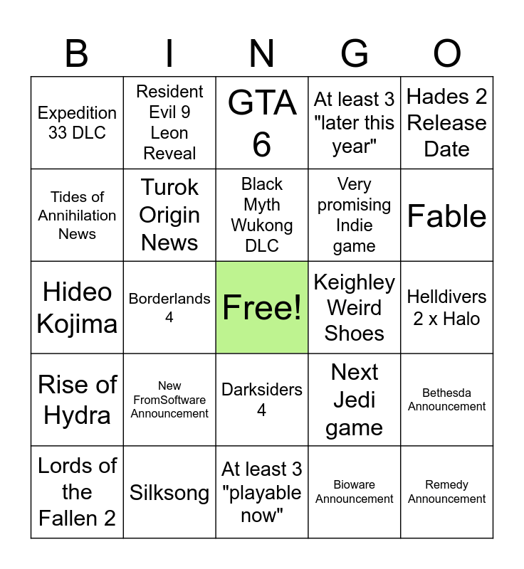 This bingo card has a free space and 24 words: New FromSoftware Announcement, Silksong, Black Myth Wukong DLC, Lords of the Fallen 2, Hades 2 Release Date, Expedition 33 DLC, Tides of Annihilation News, Resident Evil 9 Leon Reveal, Keighley Weird Shoes, Darksiders 4, Very promising Indie game, Hideo Kojima, Next Jedi game, Bethesda Announcement, Turok Origin News, Bioware Announcement, Helldivers 2 x Halo, GTA 6, Fable, Borderlands 4, Remedy Announcement, Rise of Hydra, At least 3 "later this year" and At least 3 "playable now".