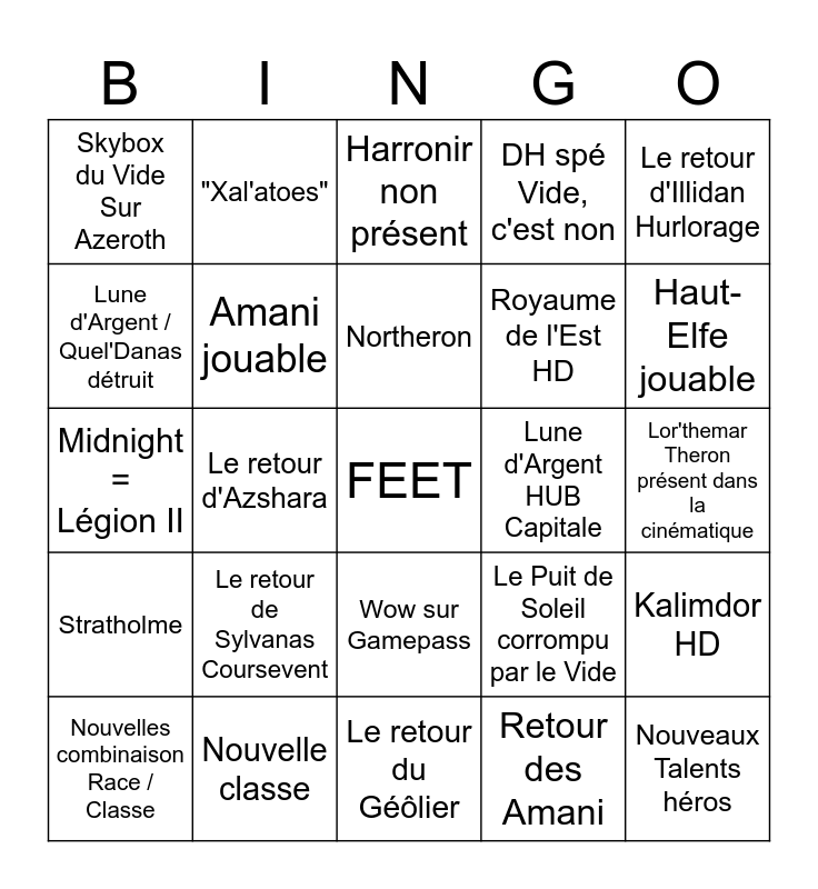 This bingo card has a free space and 24 words: Le retour de Sylvanas Coursevent, Nouvelle classe, Northeron, Nouvelles combinaison Race / Classe, Le retour d'Illidan Hurlorage, Skybox du Vide Sur Azeroth, Lune d'Argent / Quel'Danas détruit, "Xal'atoes", Lune d'Argent HUB Capitale, Wow sur Gamepass, Royaume de l'Est HD, Midnight = Légion II, Le Puit de Soleil corrompu par le Vide, Kalimdor HD, Amani jouable, Retour des Amani, Lor'themar Theron présent dans la cinématique, Harronir non présent, Haut-Elfe jouable, Le retour d'Azshara, Nouveaux Talents héros, Stratholme, DH spé Vide, c'est non and Le retour du Géôlier.