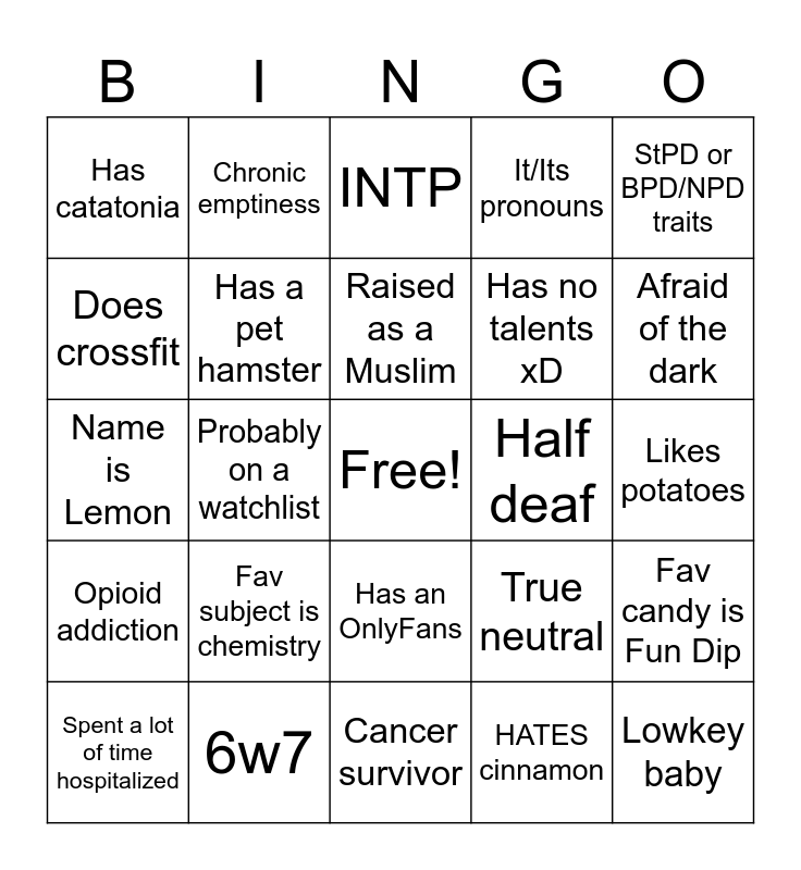This bingo card has a free space and 24 words: Fav subject is chemistry, 6w7, Raised as a Muslim, Spent a lot of time hospitalized, StPD or BPD/NPD traits, Has catatonia, Does crossfit, Chronic emptiness, Half deaf, Has an OnlyFans, Has no talents xD, Name is Lemon, True neutral, Fav candy is Fun Dip, Has a pet hamster, HATES cinnamon, Likes potatoes, INTP, Afraid of the dark, Probably on a watchlist, Lowkey baby, Opioid addiction, It/Its pronouns and Cancer survivor.