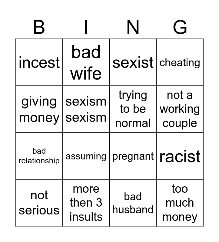 This bingo card has 16 words: more then 3 insults, racist, sexist, incest, bad relationship, bad wife, pregnant, bad husband, giving money, sexism sexism, not serious, cheating, assuming, not a working couple, trying to be normal and too much money.