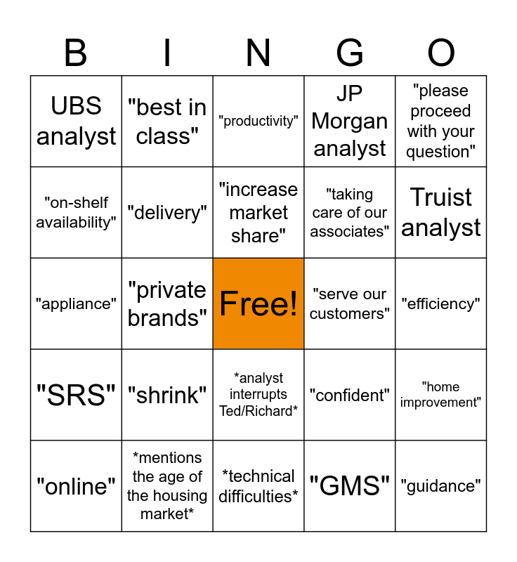 This bingo card has a free space and 58 words: "Pro", *mentions the age of the housing market*, *mentions weather*, "SRS", "GMS", "supply chain", "delivery", "win", "taking care of our associates", "live goods", JP Morgan analyst, *thanks associates*, "macroeconomic environment", "Halloween", "GAAP", UBS analyst, "guidance", "please proceed with your question", Simeon Gutman, "increase market share", "serve our customers", "productivity", "online", "home improvement", "interest rates", "efficiency", "strategic", "enhancements", Truist analyst, "ticket", "department", "building materials", "decor", "hardlines", "DIY", "fulfillment", "competitive advantage", "private brands", "appliance", "interconnected experience", "shrink", "discretionary spending", "confident", *mentions Canada or Mexico, "tariffs", "Pro ecosystem", "double-digit lift", *analyst interrupts Ted/Richard*, *technical difficulties*, "store", "DFC", "roofing", "AI", "customer satisfaction", "best in class", "capital", "on-shelf availability" and "basis points".