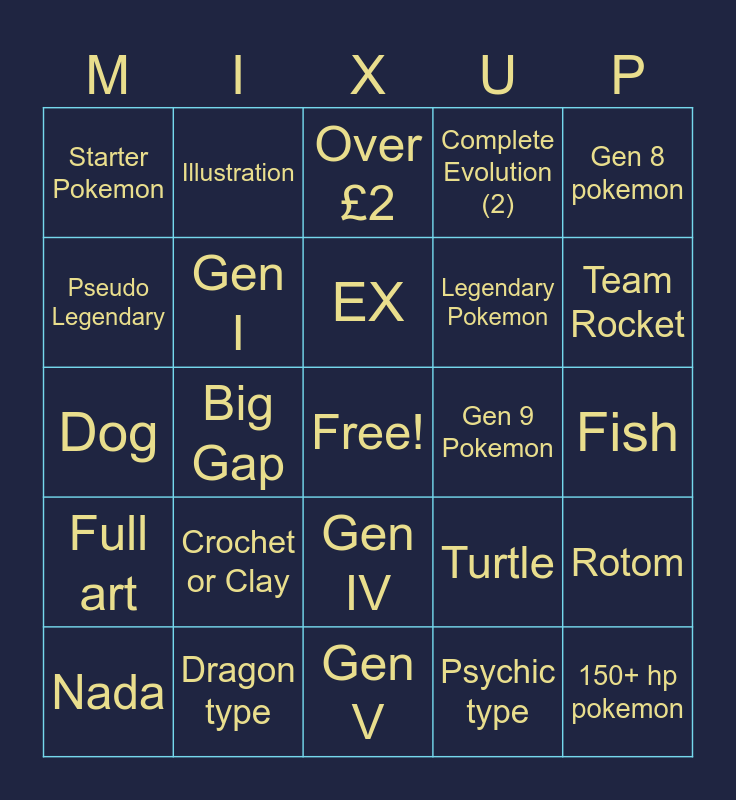 This bingo card has a free space and 60 words: Cat, Dragon type, Food Pokemon, Full art, Psychic type, Item Card, Gen I, Ace Spec, Legendary Pokemon, Trainer, Complete Evolution (2), "2 Star", Pseudo Legendary, Complete Evolution (3), Dupe, Starter Pokemon, 150+ hp pokemon, Gen 8 pokemon, Eevee, EX, Gen 9 Pokemon, Over £2, Nada, Rotom, Electric Energy, Trainer in the card, Dark Type, Cyrano 2 Star, Team Rocket, Object Pokemon, Gen II, Gen III, Baby, Rodent, Illustration, Card/mon repeat, Eeveelution, Big Gap, Gold Card, Dog, Full art "2 star", Crochet or Clay, Fish, Fire Pokemon, Turtle, Crab, Bear, Ghost Type, Metal Type, Gen IV, Gen V, Ho-oh, Garchomp or Mewtwo, Metal Energy, Plant, Attack does over 100 Damage, Attacks t do no damage, Attack requires 4 energy, Bug (not type) and Humanoid.