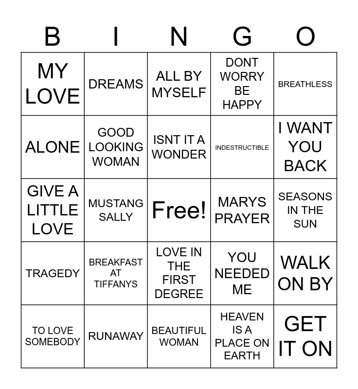 This bingo card has a free space and 44 words: ALL THAT SHE WANTS, GET IT ON, I STARTED A JOKE, TO LOVE SOMEBODY, MISSING YOU, HEAVEN IS A PLACE ON EARTH, ALL BY MYSELF, WHAT CAN I DO, BREATHLESS, RUNAWAY, DONT WORRY BE HAPPY, MARYS PRAYER, LOVE IN THE FIRST DEGREE, BREAKFAST AT TIFFANYS, 99 RED BALOONS, BEAUTIFUL WOMAN, SHANG A LANG, GIVE A LITTLE LOVE, BE MY BABY, I WANT YOU BACK, DREAMS, WHOLE AGAIN, SPICE UP YOUR LIFE, MY LOVE, AMERICAN PIE, SEASONS IN THE SUN, IF I LET YOU GO, A LITTLE BIT MORE, YOU NEEDED ME, TRAGEDY, I JUST WANNA BE LOVED, WALK ON BY, I NEED YOUR LOVING, WHEN YOUR GONE, MUSTANG SALLY, I WILL SURVIVE, YOU GOT A FRIEND, NO MATTER WHAT, ISNT IT A WONDER, ALONE, INDESTRUCTIBLE, MORE THAN A WOMAN, GOOD LOOKING WOMAN and UNDER THE BOARDWALK.
