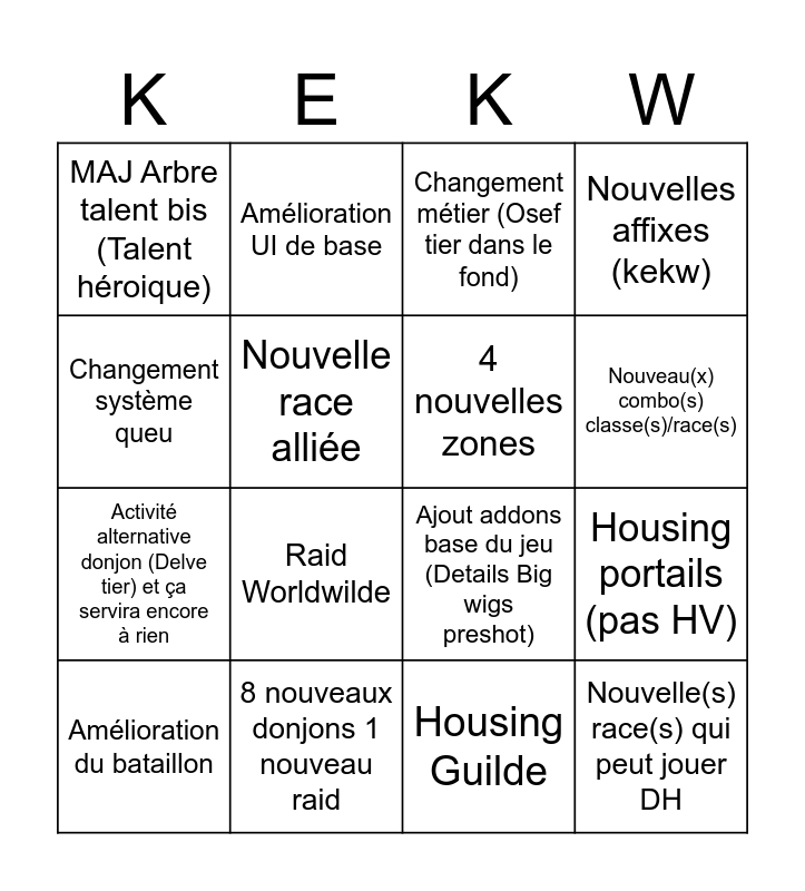 This bingo card has 16 words: 8 nouveaux donjons 1 nouveau raid, Housing portails (pas HV), Changement métier (Osef tier dans le fond), MAJ Arbre talent bis (Talent héroique), Activité alternative donjon (Delve tier) et ça servira encore à rien, Amélioration UI de base, Ajout addons base du jeu (Details Big wigs preshot), Housing Guilde, Changement système queu, Nouvelle race alliée, Amélioration du bataillon, Nouvelles affixes (kekw), Raid Worldwilde, Nouveau(x) combo(s) classe(s)/race(s), 4 nouvelles zones and Nouvelle(s) race(s) qui peut jouer DH.