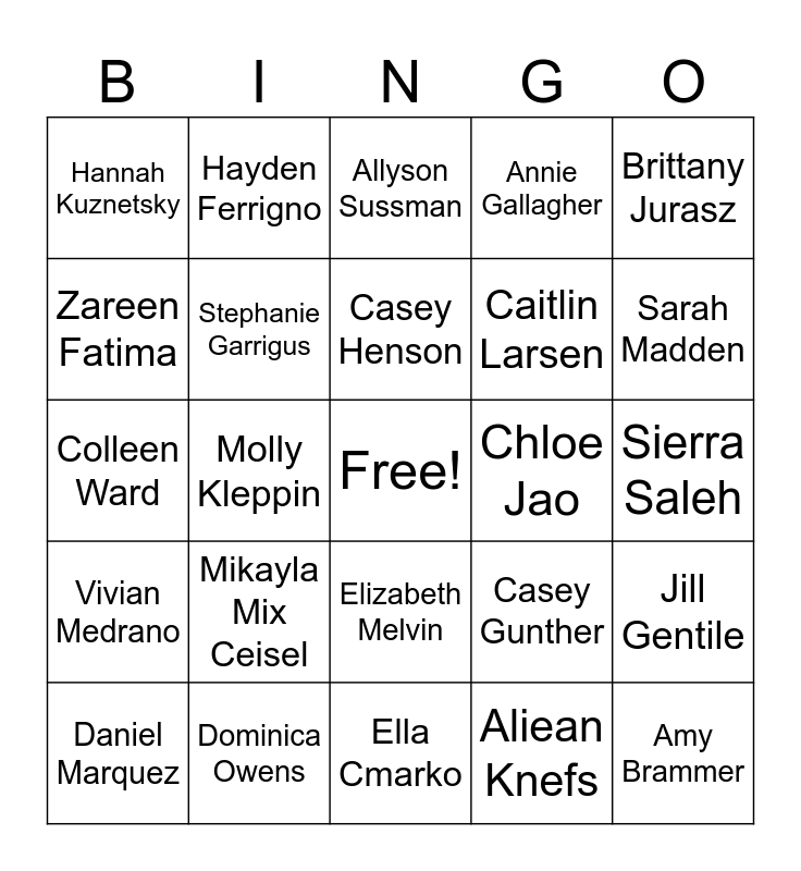 This bingo card has a free space and 48 words: Fadya Atif, Amy Brammer, Kristy Bryant, Ella Cmarko, Mikayla Mix Ceisel, Lisa Dennis-Luke, Hayden Ferrigno, Lianna Fumo, Zareen Fatima, Nate Flynn, Stephanie Garrigus, Annie Gallagher, Jill Gentile, Casey Gunther, Teresa Gulo, Nick Greiner, Casey Henson, Chloe Jao, Chloe Jones, Brittany Jurasz, Molly Kleppin, Aliean Knefs, Hannah Kuznetsky, Caitlin Larsen, Wilbert Lee, Sarah Madden, Daniel Marquez, Alexee McNulty, Elizabeth Melvin, Vivian Medrano, Nimet Merchant, Erin Neary, Nabi Nazari, Erin Oleniczak, Dominica Owens, Natalie Roti, Farah Rehman, Sierra Saleh, Chloe Schofield, Hannah Schukas, Maro Simotas, Karolina Sroka, Allyson Sussman, Afia Syeda, Colleen Ward, Stacy Watkins, Malek Umar and Jaimi Yousefi.