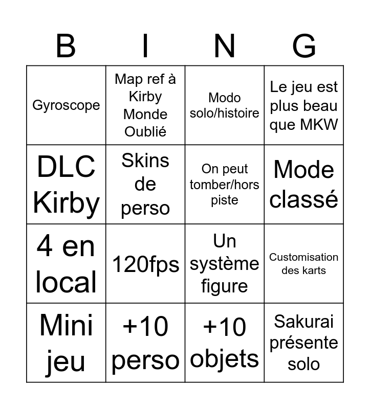 This bingo card has 16 words: +10 perso, Customisation des karts, Modo solo/histoire, Gyroscope, 4 en local, Map ref à Kirby Monde Oublié, Un système figure, +10 objets, DLC Kirby, Skins de perso, Mini jeu, Le jeu est plus beau que MKW, 120fps, Mode classé, On peut tomber/hors piste and Sakurai présente solo.