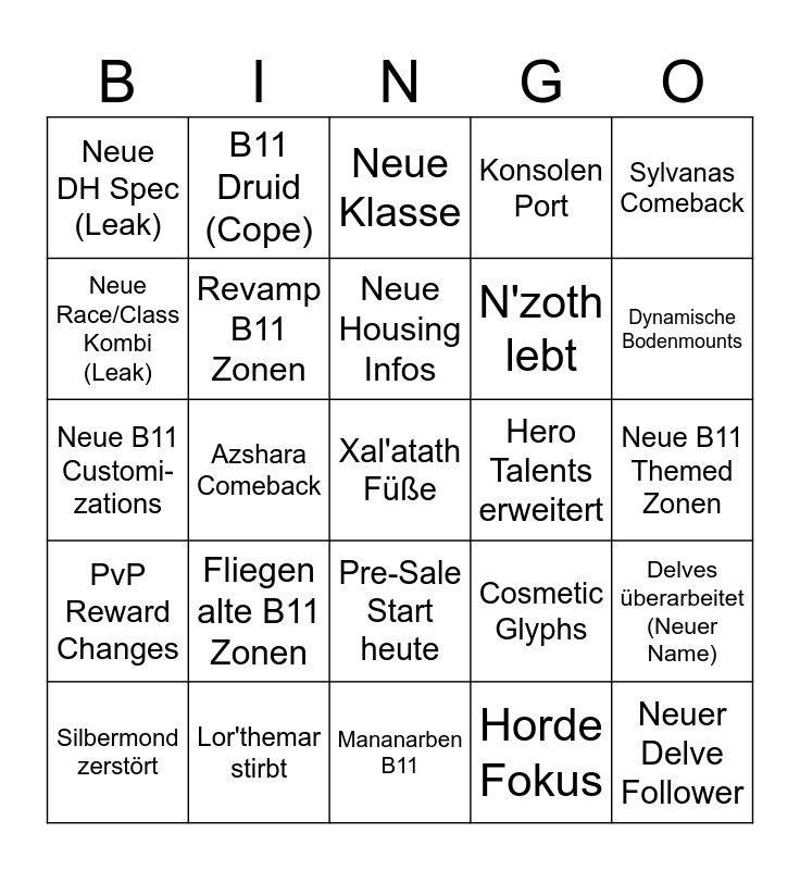 This bingo card has a free space and 24 words: Fliegen alte B11 Zonen, Lor'themar stirbt, Neue Housing Infos, Silbermond zerstört, Sylvanas Comeback, Neue DH Spec (Leak), Neue Race/Class Kombi (Leak), B11 Druid (Cope), Hero Talents erweitert, Pre-Sale Start heute, N'zoth lebt, Neue B11 Customi- zations, Cosmetic Glyphs, Delves überarbeitet (Neuer Name), Revamp B11 Zonen, Horde Fokus, Neue B11 Themed Zonen, Neue Klasse, Dynamische Bodenmounts, Azshara Comeback, Neuer Delve Follower, PvP Reward Changes, Konsolen Port and Mananarben B11.