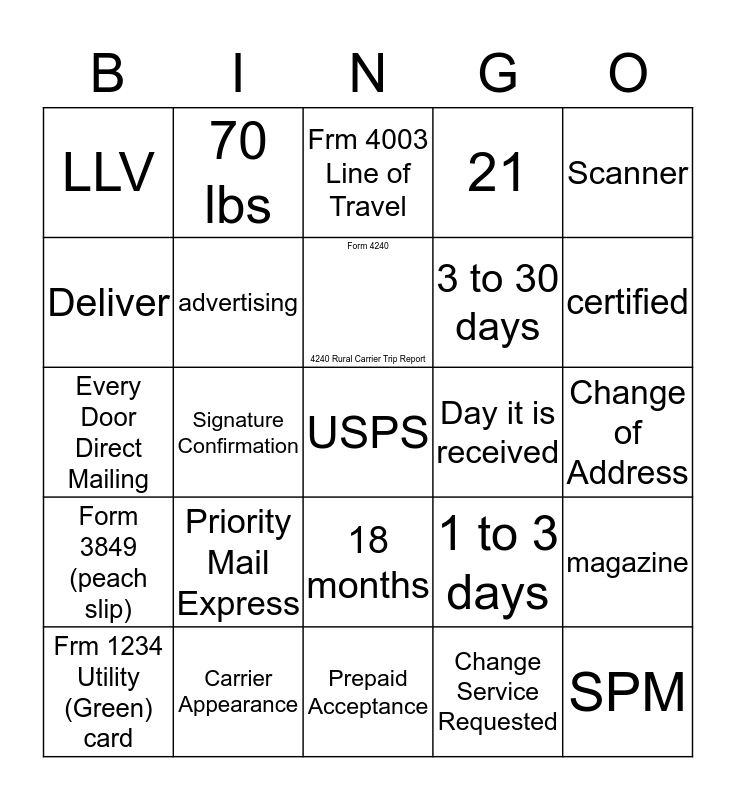 This bingo card has a free space and 24 words: Priority Mail Express, Carrier Appearance, Form 4240 4240 Rural Carrier Trip Report, Frm 1234 Utility (Green) card, Scanner, LLV, Deliver, 70 lbs, Day it is received, 18 months, 3 to 30 days, Every Door Direct Mailing, 1 to 3 days, magazine, advertising, Change Service Requested, Change of Address, Frm 4003 Line of Travel, certified, Signature Confirmation, SPM, Form 3849 (peach slip), 21 and Prepaid Acceptance.