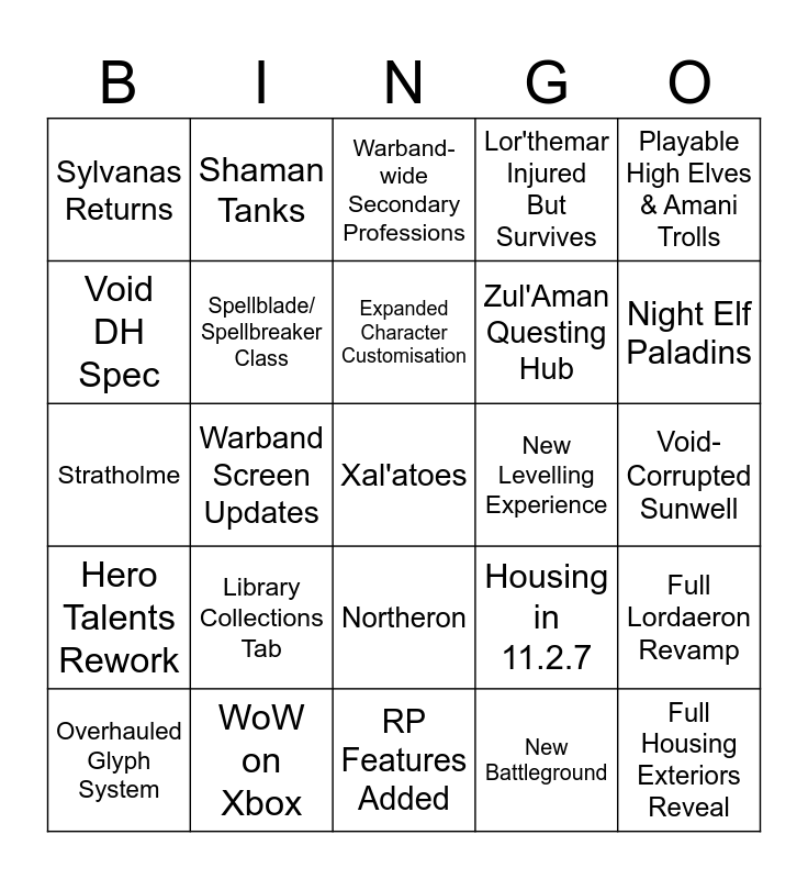 This bingo card has a free space and 24 words: Library Collections Tab, WoW on Xbox, Expanded Character Customisation, Overhauled Glyph System, Playable High Elves & Amani Trolls, Sylvanas Returns, Void DH Spec, Shaman Tanks, New Levelling Experience, Northeron, Zul'Aman Questing Hub, Stratholme, Housing in 11.2.7, Full Lordaeron Revamp, Spellblade/ Spellbreaker Class, New Battleground, Void-Corrupted Sunwell, Warband-wide Secondary Professions, Night Elf Paladins, Warband Screen Updates, Full Housing Exteriors Reveal, Hero Talents Rework, Lor'themar Injured But Survives and RP Features Added.