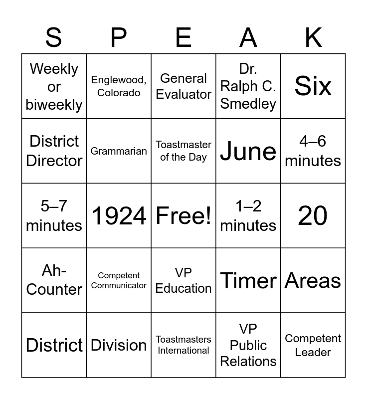 This bingo card has a free space and 36 words: Evaluator, Table Topic Master, General Evaluator, Grammarian, Timer, Ah-Counter, Toastmaster of the Day, Pathways, Six, Distinguished Toastmaster (DTM), 1924, Dr. Ralph C. Smedley, Santa Ana, California, 1–2 minutes, 4–6 minutes, Weekly or biweekly, 3 minutes, Competent Communicator, Competent Leader, General Evaluator, 20, Areas, Division, District, Toastmasters International, Englewood, Colorado, 5–7 minutes, July, June, District Director, Secretary, VP Membership, VP Public Relations, VP Education, Icebreaker and Distinguished Club.