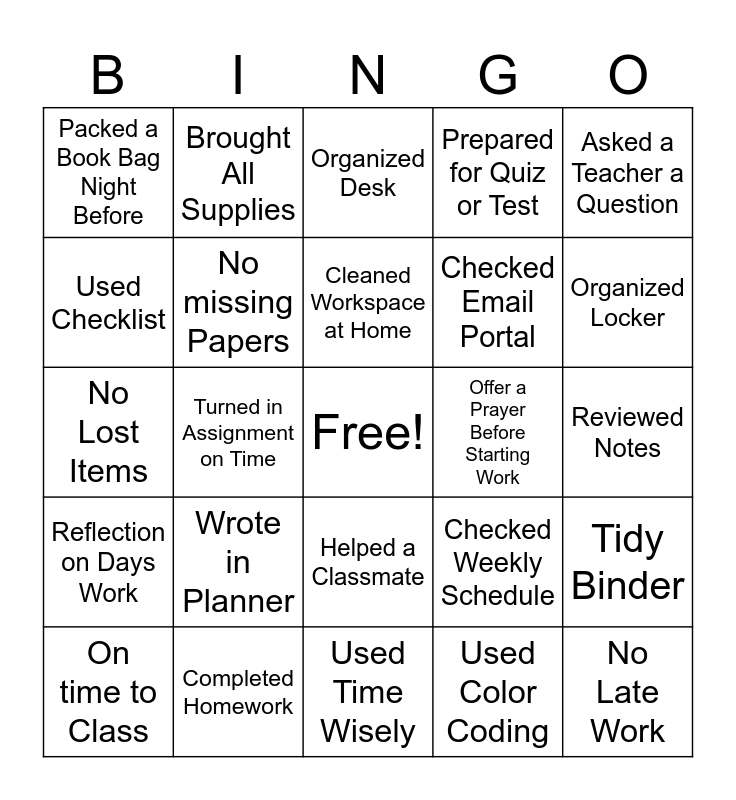 This bingo card has a free space and 24 words: Wrote in Planner, Completed Homework, Cleaned Workspace at Home, On time to Class, Asked a Teacher a Question, Packed a Book Bag Night Before, Used Checklist, Brought All Supplies, Offer a Prayer Before Starting Work, Helped a Classmate, Checked Email Portal, No Lost Items, Checked Weekly Schedule, Tidy Binder, No missing Papers, Used Color Coding, Reviewed Notes, Organized Desk, Organized Locker, Turned in Assignment on Time, No Late Work, Reflection on Days Work, Prepared for Quiz or Test and Used Time Wisely.