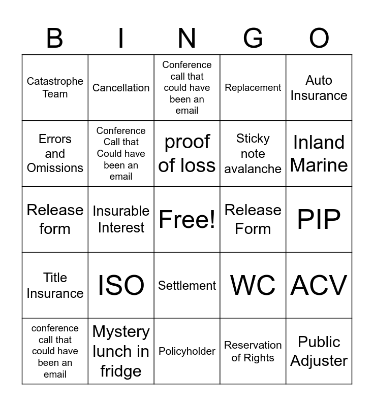 This bingo card has a free space and 24 words: ISO, Mystery lunch in fridge, proof of loss, conference call that could have been an email, Auto Insurance, Catastrophe Team, Errors and Omissions, Cancellation, Release Form, Settlement, Sticky note avalanche, Release form, WC, ACV, Conference Call that Could have been an email, Reservation of Rights, PIP, Conference call that could have been an email, Inland Marine, Insurable Interest, Public Adjuster, Title Insurance, Replacement and Policyholder.