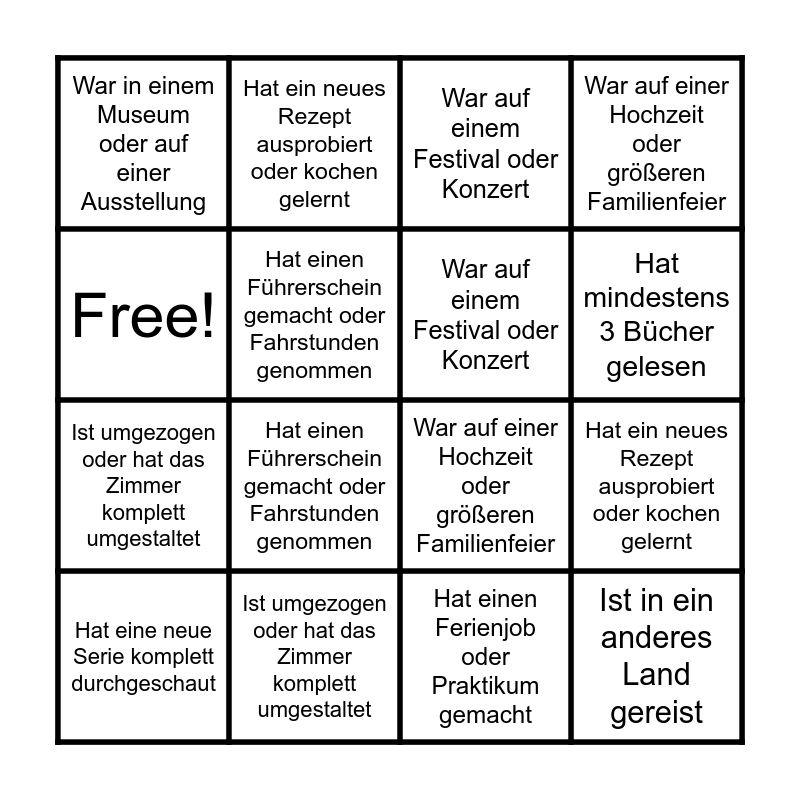 ⚠ This card has duplicate items: Hat in den Ferien einen neuen Sport ausprobiert (2), War mindestens eine Woche am Meer oder See (2), Hat eine neue Serie komplett durchgeschaut (2), War auf einem Festival oder Konzert (2), Hat einen Ferienjob oder Praktikum gemacht (2), Ist in ein anderes Land gereist (2), Hat mindestens 3 Bücher gelesen (2), War zelten oder wandern (2), Hat eine neue Freundschaft geschlossen (2), Hat ein neues Rezept ausprobiert oder kochen gelernt (2), War auf einer Hochzeit oder größeren Familienfeier (2), Hat eine neue App oder ein Spiel entdeckt (2), Ist umgezogen oder hat das Zimmer komplett umgestaltet (2), Hat einen Führerschein gemacht oder Fahrstunden genommen (2), War in einem Museum oder auf einer Ausstellung (2)