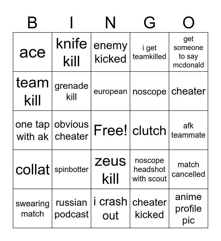 This bingo card has a free space and 24 words: spinbotter, russian podcast, european, swearing match, get someone to say mcdonald, ace, team kill, knife kill, clutch, zeus kill, noscope, one tap with ak, noscope headshot with scout, match cancelled, grenade kill, cheater kicked, afk teammate, enemy kicked, cheater, obvious cheater, anime profile pic, collat, i get teamkilled and i crash out.