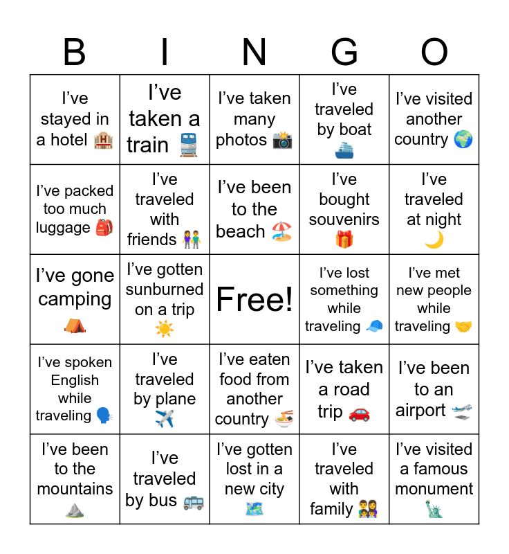 This bingo card has a free space and 24 words: I’ve traveled by plane ✈️, I’ve traveled by bus 🚌, I’ve been to the beach 🏖️, I’ve been to the mountains ⛰️, I’ve visited another country 🌍, I’ve stayed in a hotel 🏨, I’ve packed too much luggage 🎒, I’ve taken a train 🚆, I’ve lost something while traveling 🧢, I’ve eaten food from another country 🍜, I’ve bought souvenirs 🎁, I’ve gone camping ⛺, I’ve taken a road trip 🚗, I’ve been to an airport 🛫, I’ve traveled with friends 👫, I’ve traveled with family 👨👩👧👦, I’ve met new people while traveling 🤝, I’ve taken many photos 📸, I’ve traveled at night 🌙, I’ve gotten sunburned on a trip ☀️, I’ve visited a famous monument 🗽, I’ve spoken English while traveling 🗣️, I’ve traveled by boat ⛴️ and I’ve gotten lost in a new city 🗺️.
