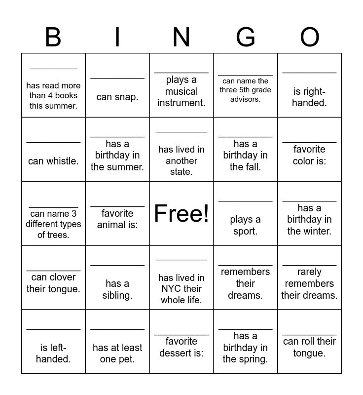 This bingo card has a free space and 24 words: __________ has a sibling., __________ has at least one pet., __________ has lived in another state., __________ is left-handed., __________ is right-handed., __________ has read more than 4 books this summer., __________ can whistle., __________ can snap., __________ plays a sport., __________ has lived in NYC their whole life., __________ has a birthday in the fall., __________ can name 3 different types of trees., __________ remembers their dreams., __________ rarely remembers their dreams., __________ has a birthday in the summer., __________ has a birthday in the spring., __________ has a birthday in the winter., __________ plays a musical instrument., __________ favorite color is:, __________ favorite animal is:, __________ can roll their tongue., __________ can clover their tongue., _____________ can name the three 5th grade advisors. and __________ favorite dessert is:.