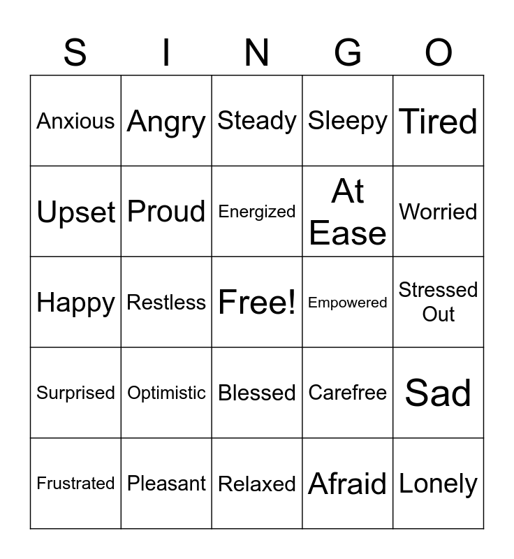 This bingo card has a free space and 24 words: Optimistic, Pleasant, Energized, Frustrated, Tired, Anxious, Upset, Angry, Empowered, Blessed, At Ease, Happy, Carefree, Sad, Proud, Afraid, Stressed Out, Steady, Worried, Restless, Lonely, Surprised, Sleepy and Relaxed.