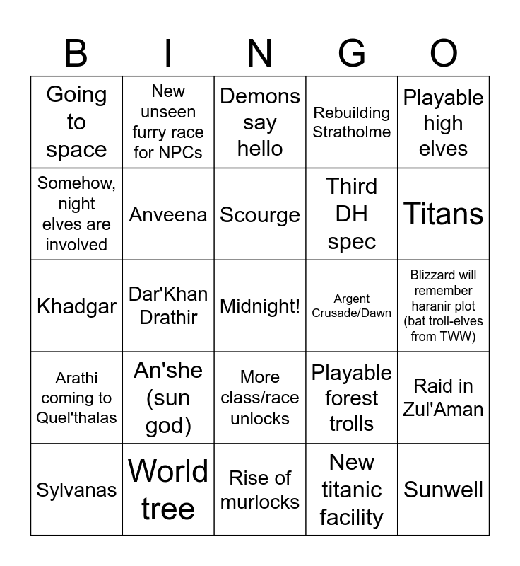 This bingo card has a free space and 39 words: Amani trolls, Kael'thas is back! (It was merely a setback!), Rebuilding Silvermoon just to nuke it, Anveena, Sylvanas, More class/race unlocks, Scourge, More voidlords (Dimensius was not enough), Playable high elves, Arathi coming to Quel'thalas, Dar'Khan Drathir, Rebuilding Stratholme, Sunwell, Blizzard will remember haranir plot (bat troll-elves from TWW), Argent Crusade/Dawn, An'she (sun god), Dreadlords, Going to space, Lightlords, Playable forest trolls, Somehow, night elves are involved, Rise of murlocks, Third DH spec, Titans, Thrall, Vereesa Windrunner, Zul'jin, Vol'jin, New kind of trolls or elves, New unseen furry race for NPCs, Jaina Proudmoore, Fel elves still exists, Demons say hello, World tree, New titanic facility, Zereth Something, Raid in Zul'Aman, Khadgar and Lor'themar Theron dies.
