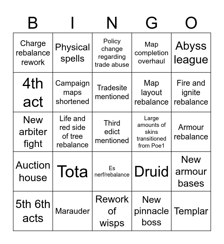 This bingo card has a free space and 24 words: Tota, Marauder, Tradesite mentioned, 5th 6th acts, Abyss league, Charge rebalance rework, 4th act, Physical spells, Large amounts of skins transitioned from Poe1, Es nerf/rebalance, Map layout rebalance, New arbiter fight, Druid, New armour bases, Campaign maps shortened, New pinnacle boss, Armour rebalance, Policy change regarding trade abuse, Fire and ignite rebalance, Life and red side of tree rebalance, Templar, Auction house, Map completion overhaul and Rework of wisps.