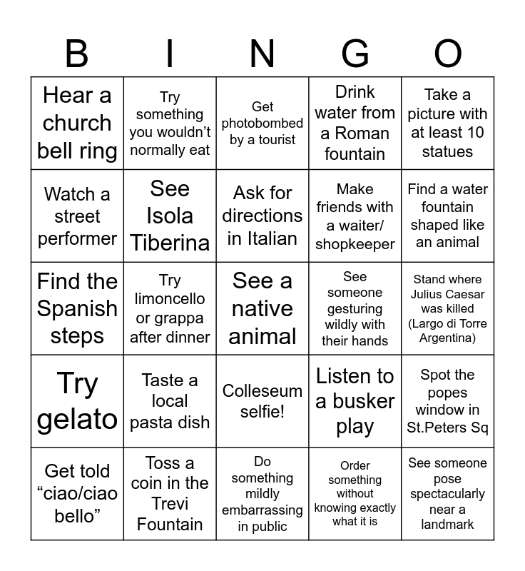 This bingo card has a free space and 24 words: Taste a local pasta dish, Toss a coin in the Trevi Fountain, Ask for directions in Italian, Get told “ciao/ciao bello”, Take a picture with at least 10 statues, Hear a church bell ring, Watch a street performer, Try something you wouldn’t normally eat, See someone gesturing wildly with their hands, Colleseum selfie!, Make friends with a waiter/ shopkeeper, Find the Spanish steps, Listen to a busker play, Spot the popes window in St.Peters Sq, See Isola Tiberina, Order something without knowing exactly what it is, Stand where Julius Caesar was killed (Largo di Torre Argentina), Get photobombed by a tourist, Find a water fountain shaped like an animal, Try limoncello or grappa after dinner, See someone pose spectacularly near a landmark, Try gelato, Drink water from a Roman fountain and Do something mildly embarrassing in public.