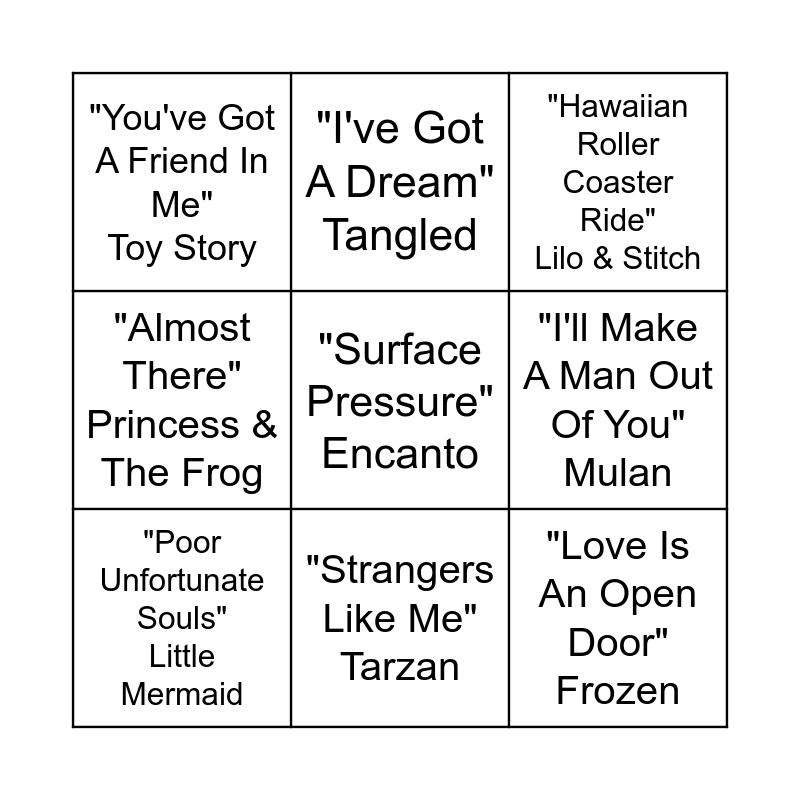This bingo card has 20 words: "Hakuna Matata" Lion King, "I Won't Say" Hercules, "Hawaiian Roller Coaster Ride" Lilo & Stitch, "Under The Sea" Little Mermaid, "This Is Me" Camp Rock, "Surface Pressure" Encanto, "A Whole New World" Aladdin, "You've Got A Friend In Me" Toy Story, "Love Is An Open Door" Frozen, "I've Got A Dream" Tangled, "Be Our Guest" Beauty & The Beast, "Bare Necessities" Jungle Book, "I'll Make A Man Out Of You" Mulan, "Eye To Eye" Goofy Movie, "Poor Unfortunate Souls" Little Mermaid, "Heigh-Ho" Snow White, "Strangers Like Me" Tarzan, "Almost There" Princess & The Frog, "Colors Of The Wind" Pocahontas and "I Always Wanted A Brother" Mufasa.