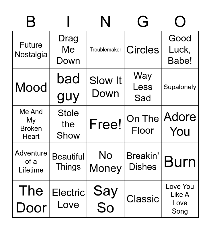 This bingo card has a free space and 39 words: Levitating, New Rules, Ocean Drive, bad guy, The Door, No Money, Slow It Down, Too Sweet, Good Luck, Babe!, Adventure of a Lifetime, Stole the Show, Circles, Love You Like A Love Song, Adore You, On The Floor, Beautiful Things, Thinking 'Bout You, Future Nostalgia, Boys Will Be Boys, Breakin' Dishes, Mood, Say So, Way Less Sad, Supalonely, Our Song, Don't Go Yet, Little Bit of Love, Follow You, Teenage Dream, Drag Me Down, Counting Stars, Don’t Blame Me, Troublemaker, Electric Love, Classic, Never Really Over, Burn, Me And My Broken Heart and I Lived.