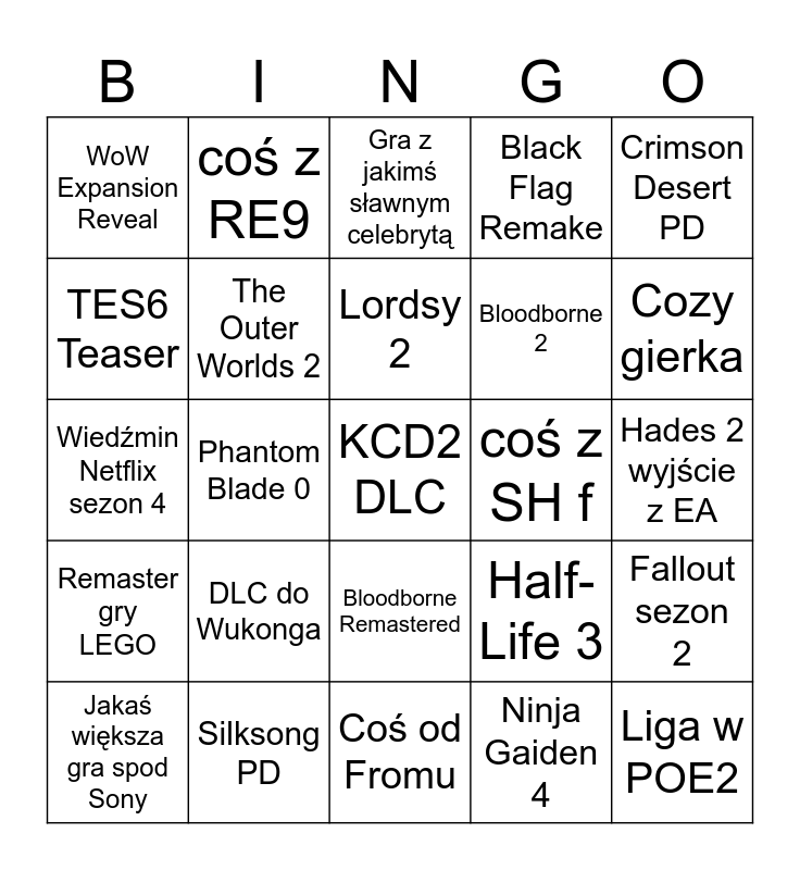 This bingo card has a free space and 24 words: DLC do Wukonga, Silksong PD, Lordsy 2, Jakaś większa gra spod Sony, Crimson Desert PD, WoW Expansion Reveal, TES6 Teaser, coś z RE9, coś z SH f, Bloodborne Remastered, Bloodborne 2, Wiedźmin Netflix sezon 4, Half-Life 3, Fallout sezon 2, The Outer Worlds 2, Ninja Gaiden 4, Hades 2 wyjście z EA, Gra z jakimś sławnym celebrytą, Cozy gierka, Phantom Blade 0, Liga w POE2, Remaster gry LEGO, Black Flag Remake and Coś od Fromu.