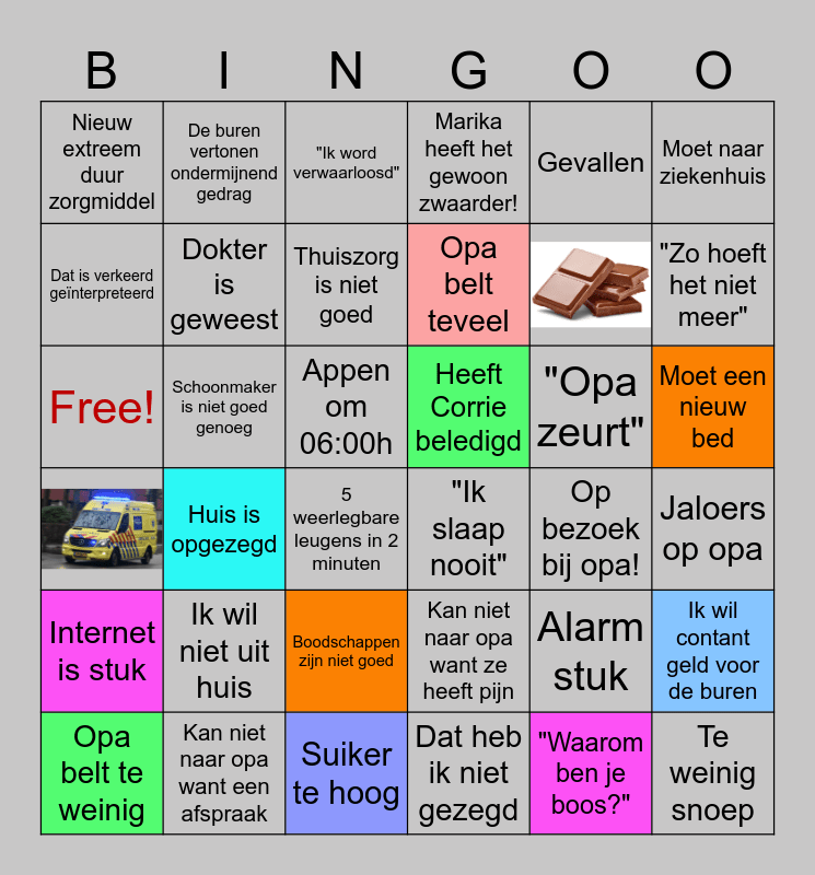 This bingo card has 2 images and 34 words: Kan niet naar opa want ze heeft pijn, Boodschappen zijn niet goed, Dat heb ik niet gezegd, Dat is verkeerd geïnterpreteerd, Heeft Corrie beledigd, Dokter is geweest, Suiker te hoog, Gevallen, Alarm stuk, "Zo hoeft het niet meer", Marika heeft het gewoon zwaarder!, Ik wil contant geld voor de buren, Schoonmaker is niet goed genoeg, Opa belt teveel, Nieuw extreem duur zorgmiddel, Internet is stuk, "Opa zeurt", Free!, "Ik word verwaarloosd", Appen om 06:00h, Huis is opgezegd, "Ik slaap nooit", 5 weerlegbare leugens in 2 minuten, Op bezoek bij opa!, De buren vertonen ondermijnend gedrag, Kan niet naar opa want een afspraak, Thuiszorg is niet goed, Moet naar ziekenhuis, Te weinig snoep, Opa belt te weinig, Jaloers op opa, Moet een nieuw bed, Ik wil niet uit huis and "Waarom ben je boos?".