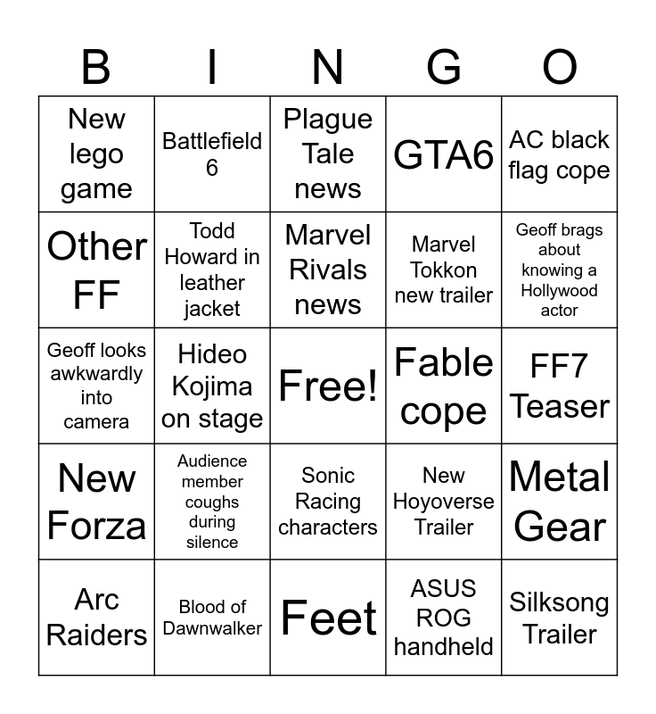 This bingo card has a free space and 24 words: Audience member coughs during silence, Blood of Dawnwalker, Marvel Rivals news, Arc Raiders, AC black flag cope, New lego game, Other FF, Battlefield 6, Fable cope, Sonic Racing characters, Marvel Tokkon new trailer, Geoff looks awkwardly into camera, New Hoyoverse Trailer, Metal Gear, Todd Howard in leather jacket, ASUS ROG handheld, FF7 Teaser, Plague Tale news, Geoff brags about knowing a Hollywood actor, Hideo Kojima on stage, Silksong Trailer, New Forza, GTA6 and Feet.