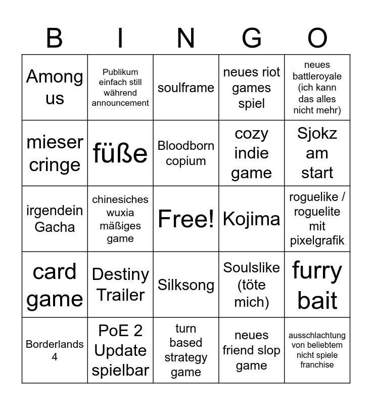 This bingo card has a free space and 24 words: Destiny Trailer, PoE 2 Update spielbar, Bloodborn copium, Borderlands 4, neues battleroyale (ich kann das alles nicht mehr), Among us, mieser cringe, Publikum einfach still während announcement, Kojima, Silksong, cozy indie game, irgendein Gacha, Soulslike (töte mich), furry bait, füße, neues friend slop game, roguelike / roguelite mit pixelgrafik, soulframe, Sjokz am start, chinesiches wuxia mäßiges game, ausschlachtung von beliebtem nicht spiele franchise, card game, neues riot games spiel and turn based strategy game.