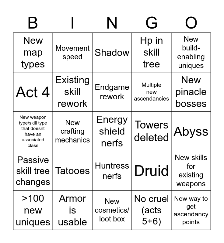 This bingo card has 25 words: Tatooes, New cosmetics/ loot box, Endgame rework, >100 new uniques, New build-enabling uniques, New map types, Act 4, Movement speed, Towers deleted, Huntress nerfs, Multiple new ascendancies, New weapon type/skill type that doesnt have an associated class, Druid, New skills for existing weapons, Existing skill rework, New way to get ascendancy points, Abyss, Shadow, New pinacle bosses, New crafting mechanics, Energy shield nerfs, Armor is usable, Passive skill tree changes, Hp in skill tree and No cruel (acts 5+6).