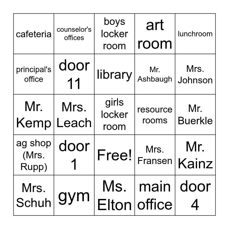 This bingo card has 26 words: Free!, main office, library, gym, lunchroom, cafeteria, principal's office, counselor's offices, Mr. Buerkle, Mrs. Fransen, Mr. Ashbaugh, Mr. Kemp, Mr. Kainz, Mrs. Schuh, Mrs. Leach, nurse's office, art room, ag shop (Mrs. Rupp), boys locker room, girls locker room, Mrs. Johnson, Ms. Elton, resource rooms, door 1, door 11 and door 4.
